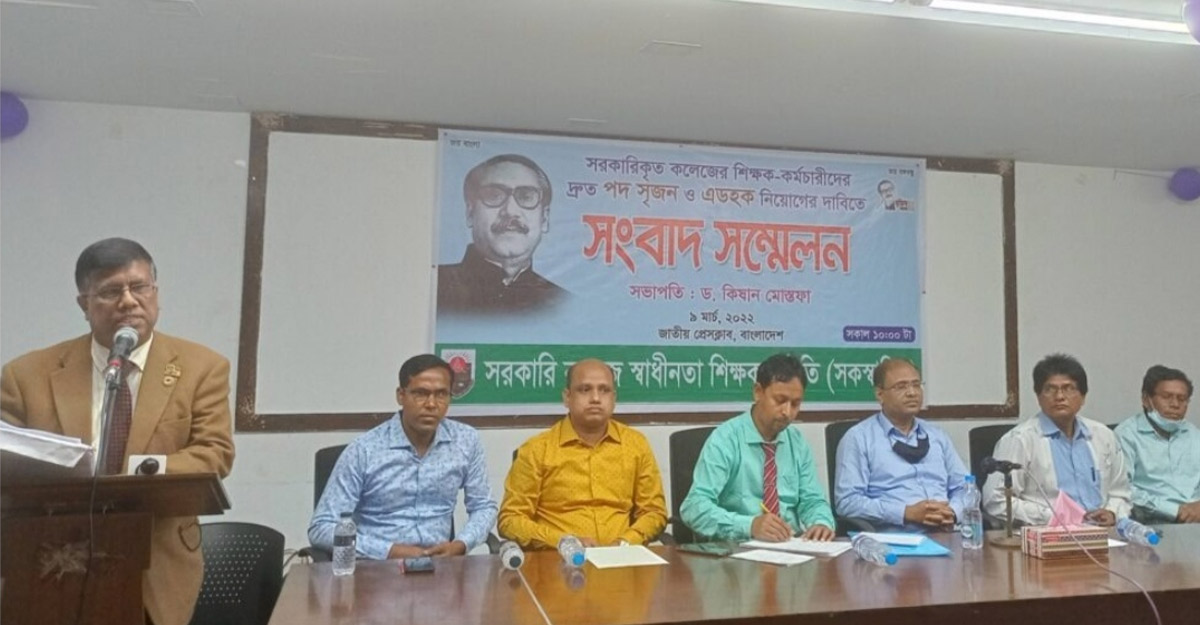 আগামী ৩০ জুনের মধ্যে এডহক নিয়োগ দেওয়াসহ নয় দাবিতে সংবাদ সম্মেলন করেছে সরকারি কলেজ স্বাধীনতা শিক্ষক সমিতি (সকস্বাশিস)।