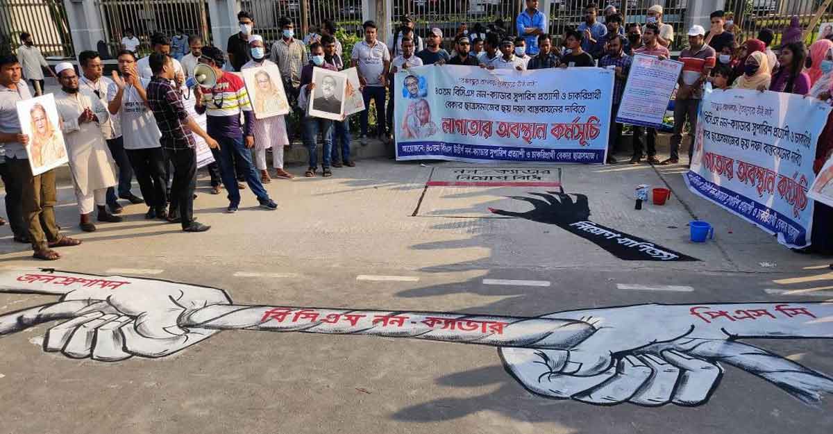 নন-ক্যাডার নিয়োগে আগের নিয়ম বহালসহ ছয় দফা দাবি নিয়ে ১৪তম দিনের মতো অবস্থান কর্মসূচি পালন করছেন বিসিএস নন-ক্যাডার চাকরিপ্রত্যাশীরা। আজকের কর্মসূচির অংশ হিসেবে তারা রাস্তায় আল্পনা অঙ্কন ও রম্য বিতর্কের মাধ্যমে প্রতিবাদ জানাচ্ছেন।