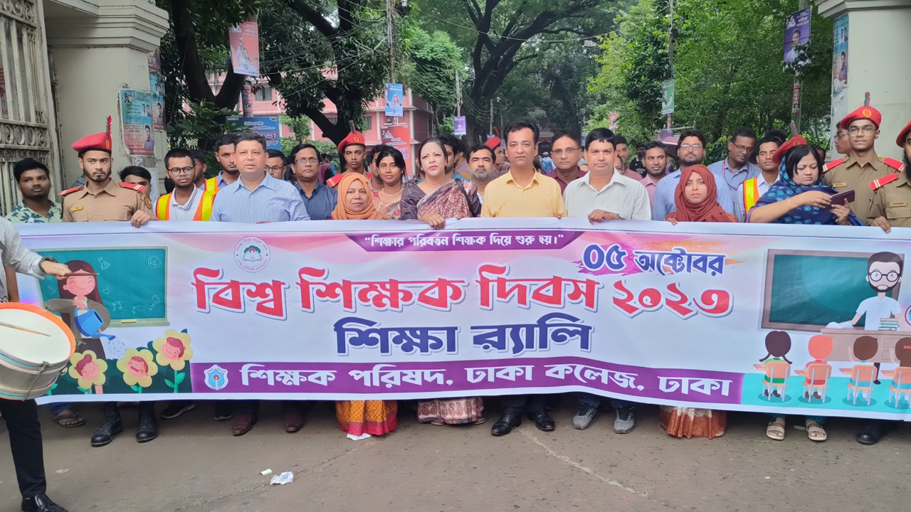 ‘শিক্ষার পরিবর্তন শিক্ষক দিয়ে শুরু হয়’ স্লোগানে বিশ্ব শিক্ষক দিবস উপলক্ষ্যে ঢাকা কলেজে বর্ণাঢ্য র্যালি করেছেন শিক্ষকরা।