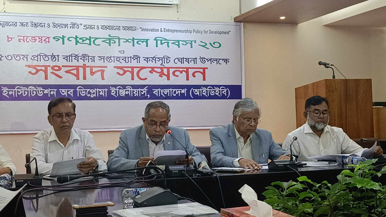 এদিকে ৮ নভেম্বর আইডিইবি'র ৫৩তম প্রতিষ্ঠাবার্ষিকী ও গণপ্রকৌশল দিবস উপলক্ষ্যে নানা কর্মসূচি হাতে নিয়েছে সংগঠনটি। সংবাদ সম্মেলনের আইডিইবি'র সাধারণ সম্পাদক মো. শামসুর রহমান জানান, জাতীয় টেকসই উন্নয়নে আগামীর চ্যালেঞ্জ মোকাবিলার গণমানুষের উদ্ভাবনী ধারণা ও উদ্যোক্তা বিকাশের বিষয়টি সামনে রেখে এবারের দিবসের প্রতিপাদ্য নির্ধারণ করা হয়েছে ‘উন্নয়নের জন্য উদ্ভাবন ও উদ্যোক্তা নীতি’।