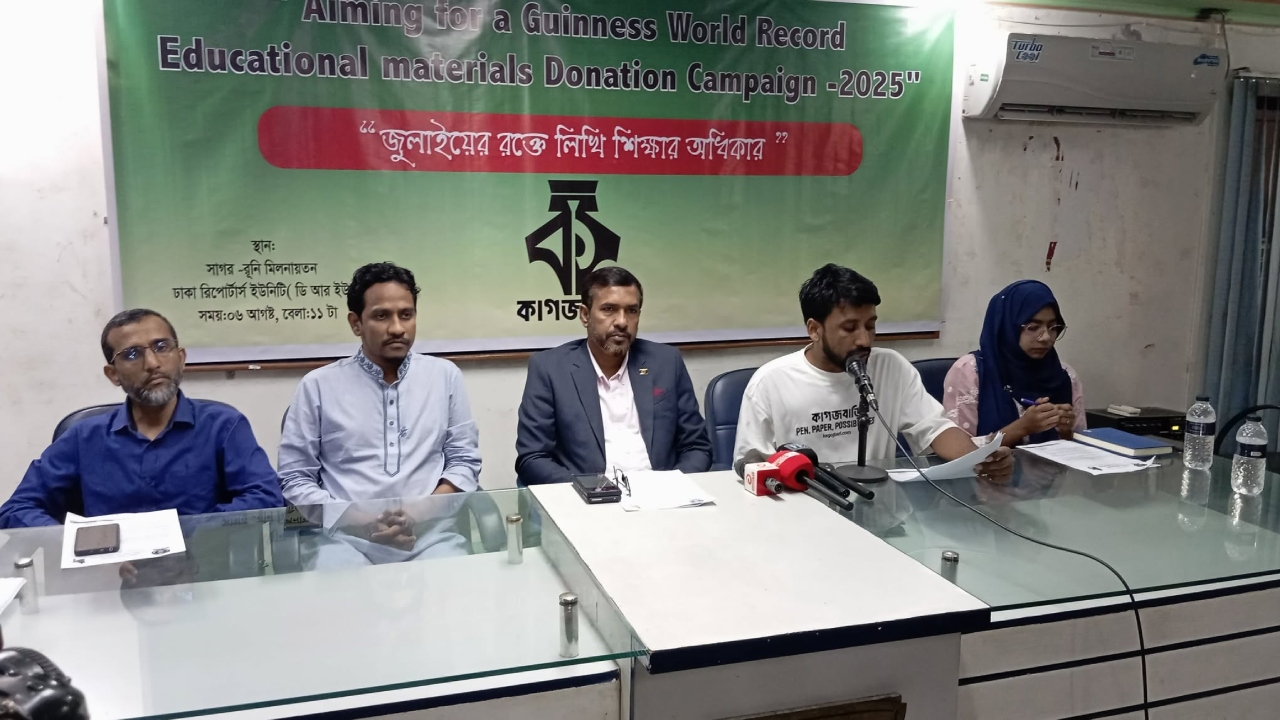 তিনি বলেন, জাতীয় জীবনে এক গুরুত্বপূর্ণ মোড় ঘোরানো জুলাই বিপ্লবের চেতনাকে স্মরণীয় করে রাখতে ‘কাগজবাড়ি’ নামের একটি শিক্ষাবান্ধব প্রতিষ্ঠান এই ক্যাম্পেইনের আয়োজন করছে। এই আয়োজনে ১২ ঘণ্টায় সারা দেশের এক হাজার ৫০০টি স্কুলে প্রায় সাড়ে ৪ লাখ শিক্ষার্থীর হাতে বিনামূল্যে এক মাসের শিক্ষা সামগ্রী তুলে দেওয়া হবে, যার মোট ওজন প্রায় ৬০ হাজার কেজি। এটি আমরা আগস্ট মাসেই করবো। দিনক্ষণ ঠিক করে জানানো হবে।