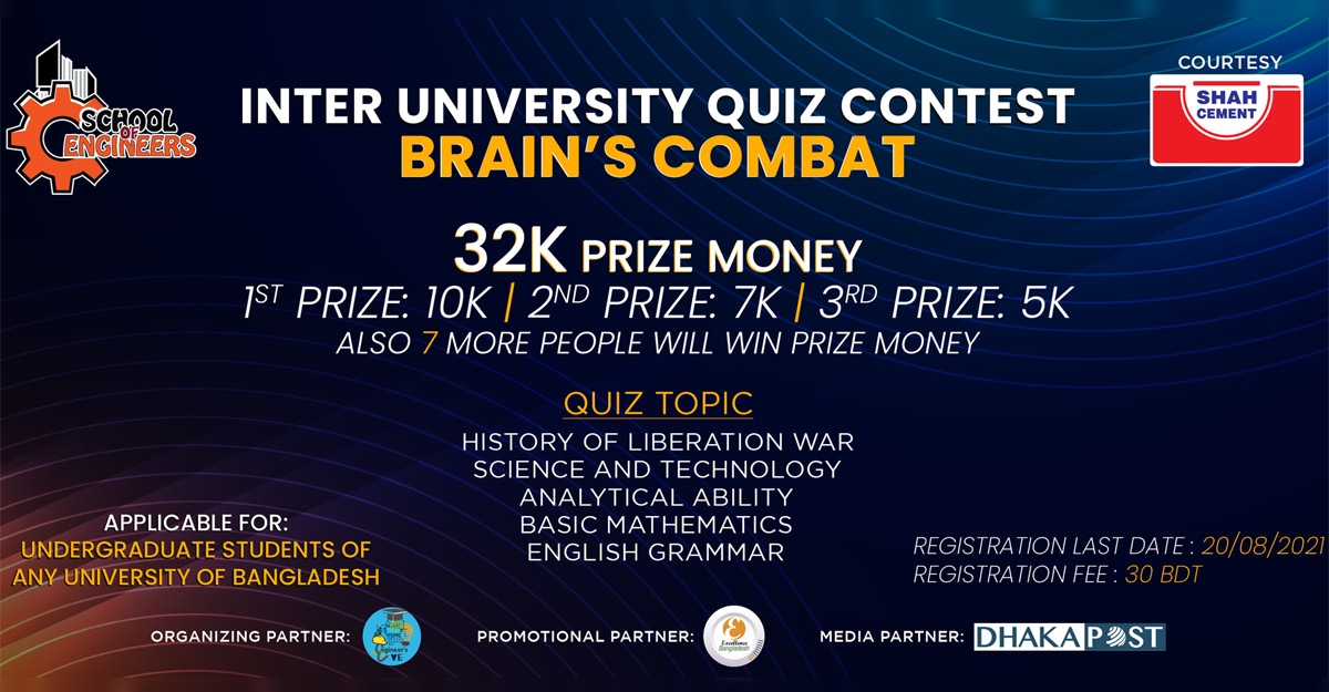 দেশে প্রথমবারের মতো বিশ্ববিদ্যালয় পড়ুয়া শিক্ষার্থীদের জন্য ব্রেইনস কম্ব্যাট কুইজ প্রতিযোগিতার আয়োজন করতে যাচ্ছে স্কুল অব ইঞ্জিনিয়ার্স। অনলাইনে অনুষ্ঠিত হবে এই কুইজ প্রতিযোগিতা।