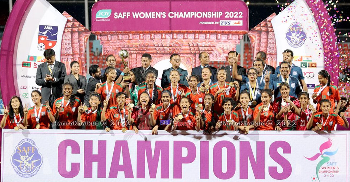 প্রথমবারের মতো ‘নারী সাফ চ্যাম্পিয়নশিপ’ জিতে ইতিহাস গড়েছে বাংলাদেশ। সোমবার (১৯ সেপ্টেস্বর) সন্ধ্যায় নেপালের দশরথ রঙ্গশালা স্টেডিয়ামে স্বাগতিকদের স্বপ্ন ভঙ্গ করে অনন্য, ঐতিহাসিক এই বিজয় ছিনিয়ে আনে বাংলার বাঘিনীরা। পুরো টুর্নামেন্টেই তারা ছিল দুর্দান্ত, অপরাজিত। নারীদের হাত ধরে দক্ষিণ এশিয়ার সেরা হওয়ার গৌরবে মেতেছে গোটা বাংলাদেশ। লাল-সবুজের বিজয় নিশান উড়ছে প্রতিটি বাঙালির হৃদয়ে। গণমাধ্যম থেকে সামাজিক মাধ্যম সবখানেই চলছে বিজয় বন্দনা। বিজয়ী নারী ফুটবল দলকে অভিনন্দন-শুভেচ্ছা-প্রশংসায় ভাসাচ্ছেন সবাই। এই দলে সামিল হয়েছেন দেশের শোবিজ অঙ্গনের তারকারাও।