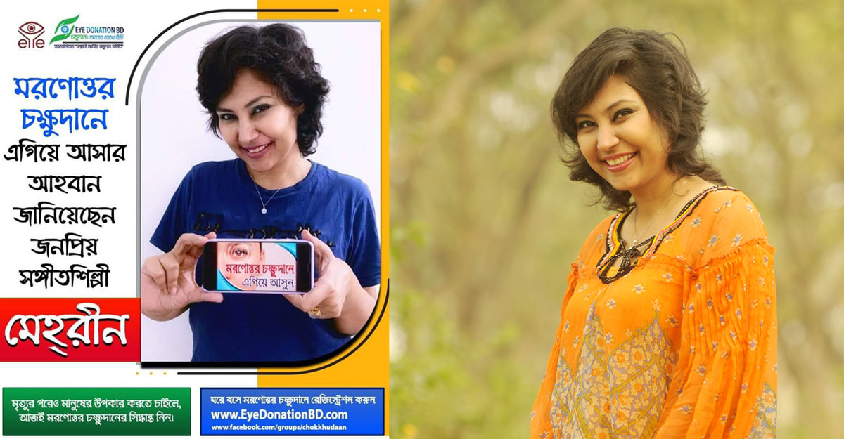 ‘আনাড়ি’ গায়িকা এবার জানালেন মরণোত্তর চক্ষুদানে এগিয়ে আসার আহ্বান। মূলত ‘অন্যের চোখে বাঁচি’ (মরণোত্তর চক্ষুদান) নামের একটি ফেসবুক গ্রুপের মাধ্যমে এই আহ্বান জানান তিনি। গ্রুপে মরণোত্তর চক্ষুদানের আহ্বান জানিয়ে মেহরীনের ছবি সম্বলিত একটি পোস্টারও প্রকাশ করা হয়েছে।
