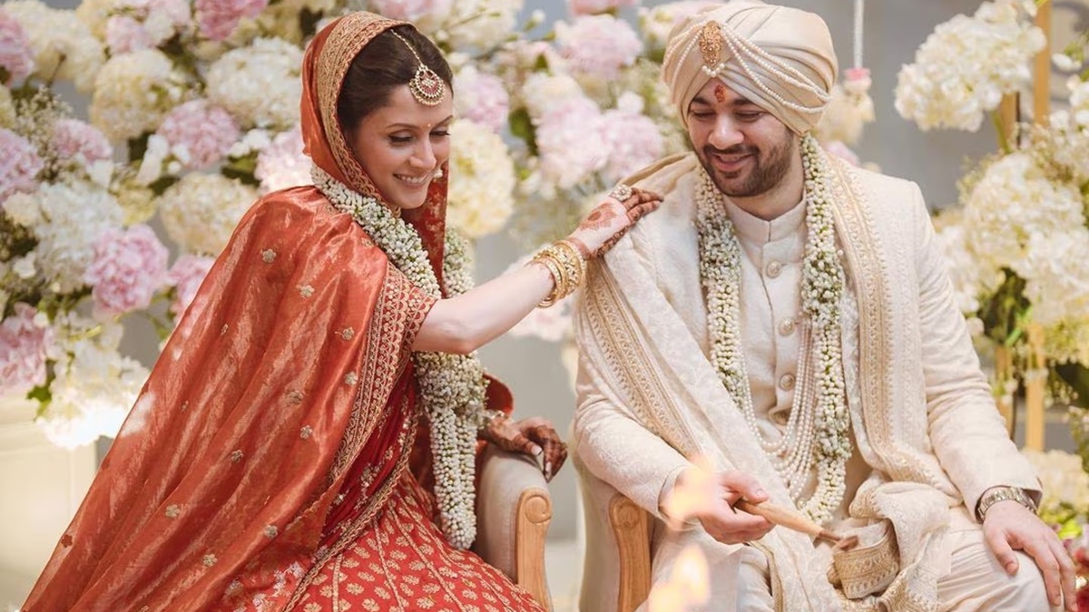 রোববার বিয়েতে করণ পরেছিলেন সাদা শেরওয়ানি ও দ্রিশা পরেছিলেন লাল লেহেঙ্গা।