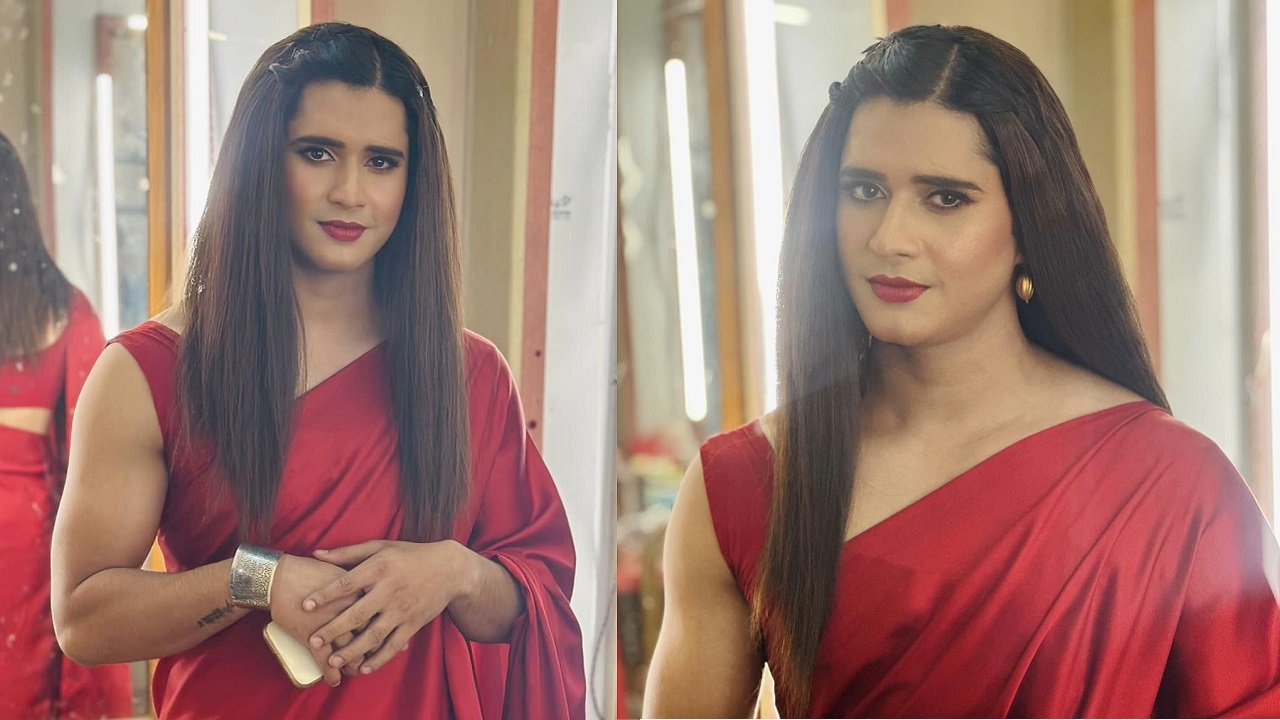 লাল শার্টিনের শাড়ি, কাঁধ অবধি লম্বা চুল, ঠোঁটে লাল রঙের লিপস্টিকে যেন চোখ ফেরানোই দায়! লাস্যময়ী সাজে এই নারী আসলে কোনো অভিনেত্রী নন, তিনি একজন অভিনেতা!