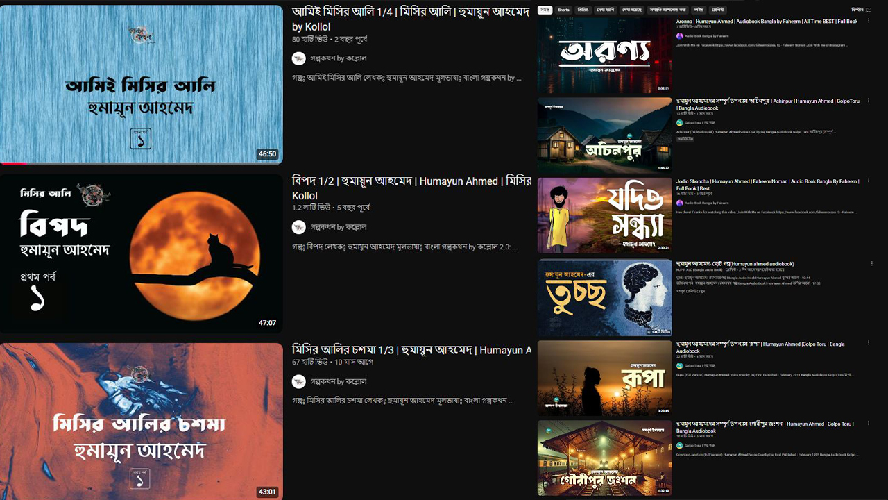এখনকার সময়ে ইউটিউব স্ক্রল করলে দেখা যায়, হুমায়ূন আহমেদের একাধিক জনপ্রিয় বইয়ের অডিও সংস্করণ তৈরি করছে ইউটিউবাররা; যা দারুণ সাড়াও ফেলছে। এর মধ্যে উল্লেখযোগ্য, ‘মিসির আলি সিরিজ’, ‘হিমু সিরিজ’। এছাড়াও রয়েছে ‘অরণ্য’, ‘অচিনপুর’, ‘যদিও সন্ধ্যা’, ‘অরণ্য’, ‘চিনপুর’, ‘যদিও সন্ধ্যা’, ‘তুচ্ছ’, ‘রুপা’, ‘গৌরীপুর জংশন’, ‘তন্দ্রা বিলাস’, ‘নিশীথিনী’ সহ এমন অসংখ্য বই-গল্পের অডিও সংস্করণ রয়েছে ইউটিউবে।
