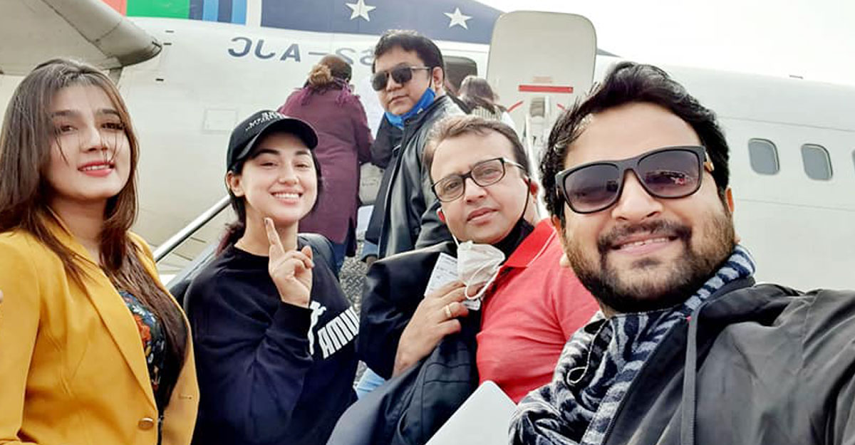 বিমানে ওঠার সময় মাহিয়া মাহি, অপু বিশ্বাস, মীর সাব্বির, রিয়াজ ও সাইমন সাদিক, ছবি : সংগৃহীত
