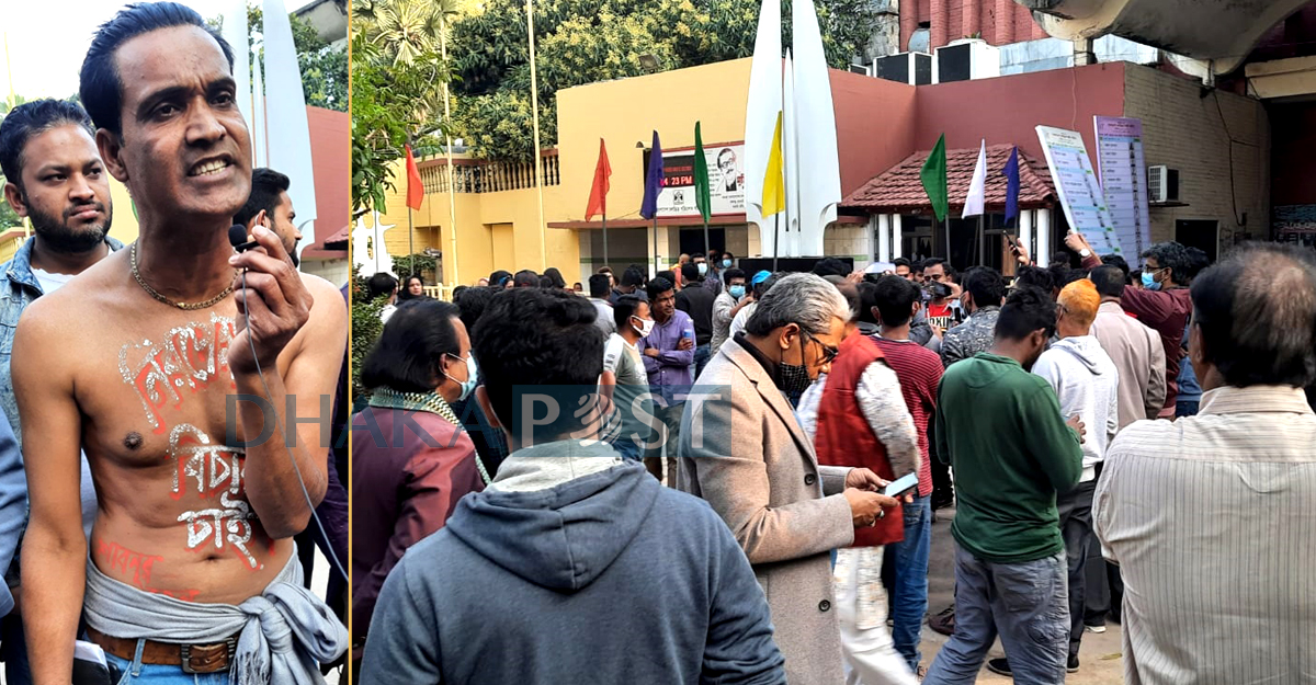 শনিবার (৫ ফেব্রুয়ারি) পুনরায় উত্তাল হয়ে উঠেছে এফডিসি আঙিনা। বিক্ষুব্ধ শিল্পীরা আন্দোলন করছেন। কেউ কেউ খালি গায়ে ‘নিরপেক্ষ বিচার চাই’ স্লোগান লিখেও সামিল হয়েছেন প্রতিবাদে।