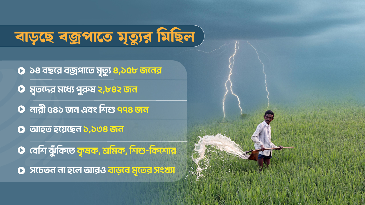 বজ্রপাতে ১৪ বছরে (২০১০-২০২৪ সাল) প্রাণ গেল ৪ হাজার ১৫৮ জনের। নিহতদের মধ্যে শিশু ৭৭৪ জন, নারী ৫৪১ জন এবং পুরুষ ২ হাজার ৮৪২ জন। সবচেয়ে বেশি মৃত্যুর ঘটনা ঘটেছে ২০২১ সালে। সেবছর ৩৬২ জন প্রাণ হারিয়েছেন। আর এককভাবে সর্বোচ্চ পুরুষের মৃত্যু ঘটেছে ২০২০ সালে। যার সংখ্যা ২৭১ জন