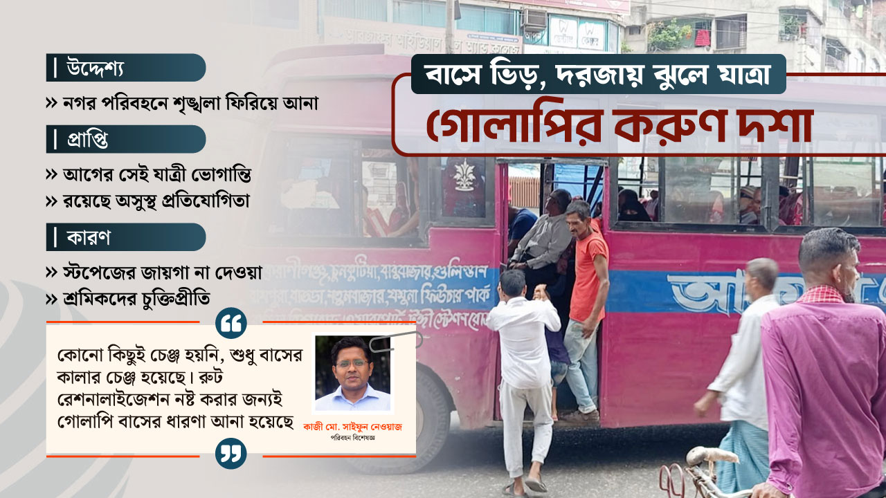 কিন্তু বাস্তবতা হলো, কে শোনে কার কথা! পূর্ববর্তী আওয়ামী লীগ সরকারের সময় যেমন করে হারিয়ে গিয়েছিল নগর পরিবহনের সেবা, তেমনি গত পাঁচ মাসে হারিয়ে গেছে এই গোলাপি বাসের শৃঙ্খলা।