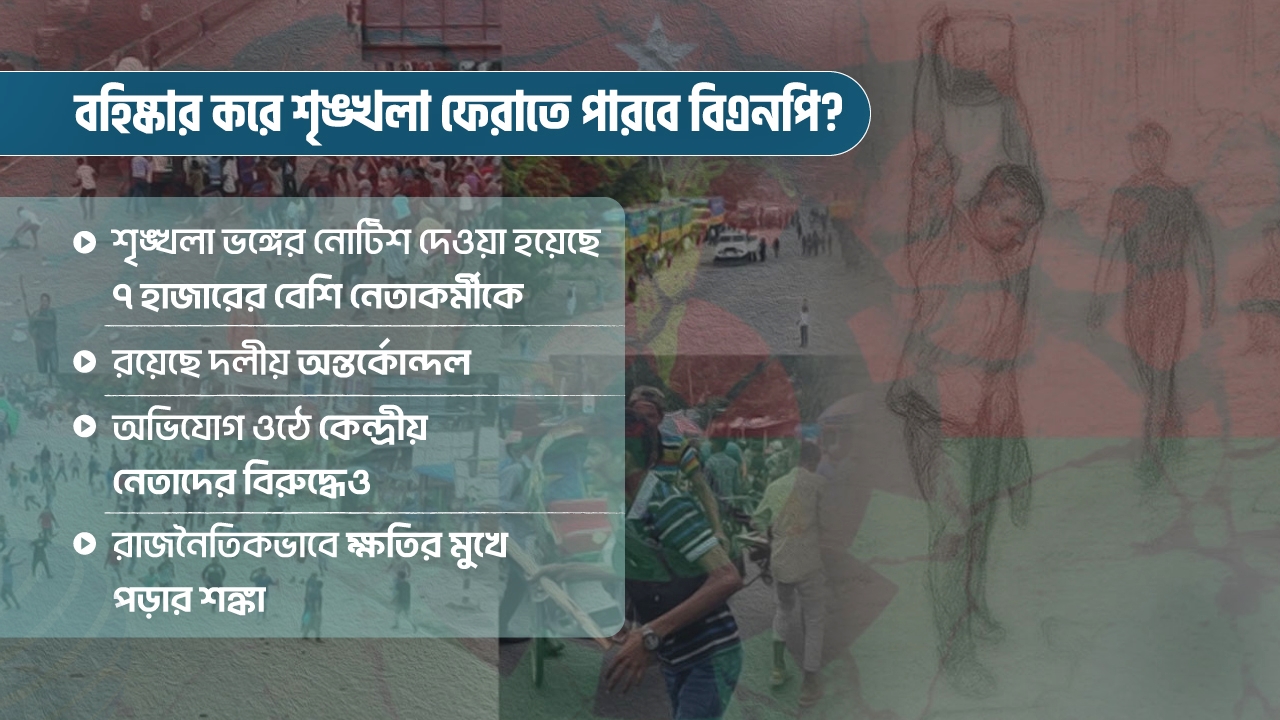 দলের সূত্রে জানা গেছে, গত বছরের আগস্ট মাস থেকে এখন পর্যন্ত বিভিন্ন অপরাধে জড়িত থাকার অভিযোগে কারণ দর্শানো, বহিষ্কার, সতর্ক করা, সাংগঠনিক শৃঙ্খলা ভঙ্গের নোটিশ দেওয়া হয়েছে বিএনপির ৭ হাজারের বেশি নেতাকর্মীকে। শুধু তাই নয়, অনেকের বিরুদ্ধে সাংগঠনিক ব্যবস্থা নেওয়ার পাশাপাশি আইনগত ব্যবস্থাও নেওয়া হয়েছে।