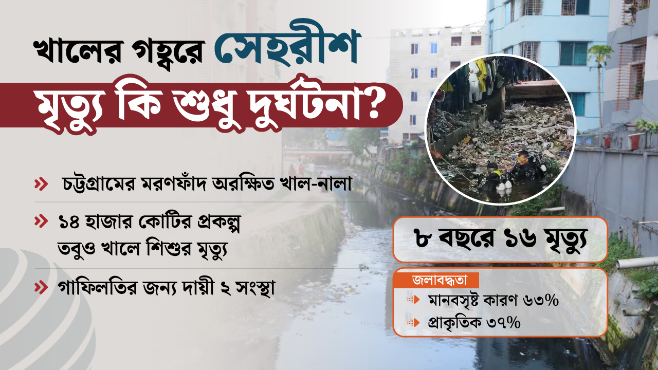 জানা গেছে, চট্টগ্রাম শহরে জলাবদ্ধতার সমস্যা নিরসনে ১৪ হাজার ৩৯৯ কোটি টাকা ব্যয়ে চারটি বড় প্রকল্প বাস্তবায়ন করা হচ্ছে। প্রকল্পগুলোতে খাল পুনঃখনন, ড্রেনেজ ব্যবস্থা উন্নয়ন, রেগুলেটর স্থাপন এবং সড়ক নির্মাণ অন্তর্ভুক্ত রয়েছে। এসব প্রকল্পের আওতায় থাকা খাল-নালা দীর্ঘদিন ধরে উন্মুক্ত অবস্থায় পড়ে আছে। ফলে বছরের পর বছর দুর্ঘটনায় প্রাণ হারাচ্ছেন পথচলতি মানুষ।