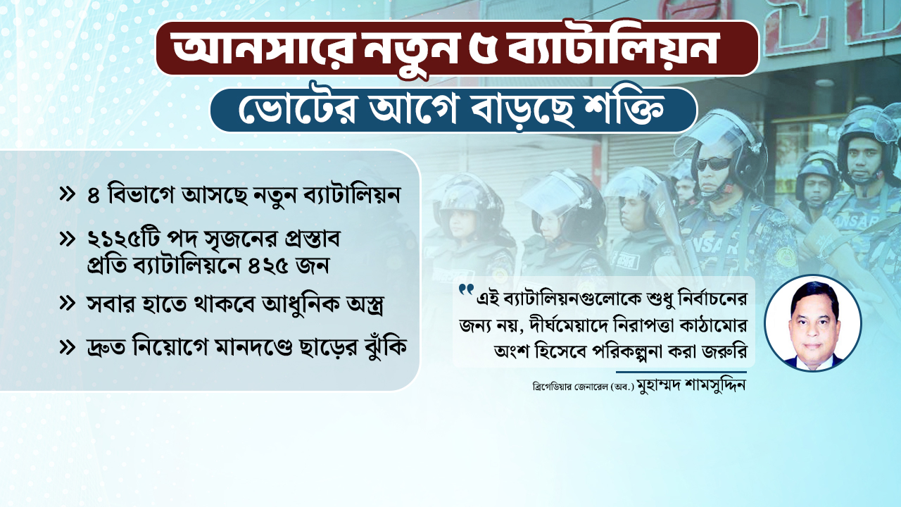 নিরাপত্তা বিশ্লেষক ব্রিগেডিয়ার জেনারেল (অব.) সরকার মুহাম্মদ শামসুদ্দিন ঢাকা পোস্টকে বলেন, ২০২৬ সালের জাতীয় নির্বাচন শুধু রাজনৈতিক প্রতিযোগিতা নয়, বরং এটি দেশের আইনশৃঙ্খলা বাহিনীর জন্যও বড় পরীক্ষা। বিগত নির্বাচনগুলোতে দেখা গেছে, সহিংসতা নিয়ন্ত্রণ, ভোটকেন্দ্র সুরক্ষা এবং কেন্দ্রীয় স্থাপনাগুলোর পাহারায় আনসার বাহিনীর অবদান গুরুত্বপূর্ণ ছিল। বর্তমানে ৪২টি ব্যাটালিয়নে প্রায় ১৮ হাজার সদস্য থাকলেও এর বড় অংশ গুরুত্বপূর্ণ স্থাপনা ও প্রকল্পে ব্যস্ত থাকায় নির্বাচনী সময়ে পর্যাপ্ত জনবল হাতে থাকে না। নতুন পাঁচটি ব্যাটালিয়ন গঠনের সিদ্ধান্ত তাই সময়োপযোগী।