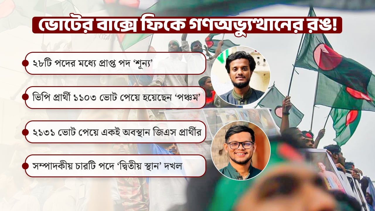 এমন পরিণতির সুনির্দিষ্ট কোনো কারণ বিশ্লেষণ করেছেন কি না— জানতে চাইলে তিনি বলেন, ‘অনেকগুলো সম্মিলিত কারণে এই পরিণতি। প্রার্থীদের মধ্যে সমন্বয়হীনতার অভাব, ডাকসু নিয়ে দল থেকে পরিকল্পনা, প্রার্থীদের সক্ষমতা— সবকিছু মিলিয়েই এমন ভরাডুবি। এখানে একক কোনো কারণ নেই।’