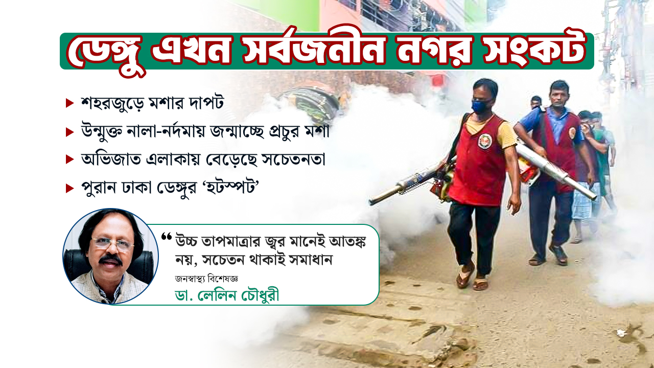 ঘরে-বাইরে মশার উপদ্রবে অতিষ্ঠ ঢাকাবাসী। সাম্প্রতিক সময়ে ডেঙ্গুর ভয় সর্বজনীন নগর আতঙ্ক হয়ে সামনে এসেছে। প্রায় প্রতিটি মহল্লায় নগরবাসীর জন্য এখন মশাবাহিত রোগ বড় ধরনের ঝুঁকিতে পরিণত হয়েছে। এমন অবস্থায় ডেঙ্গু সংক্রমণকে আরও তীব্র করছে ঢাকার ‘জনঘনত্ব’ ও ‘অপরিচ্ছন্নতা’। শহরজুড়ে উন্মুক্ত নালা, নর্দমা ও জমে থাকা পানিতে মশার প্রজনন ত্বরান্বিত হচ্ছে, যা ডেঙ্গুর বিস্তারকে আরও তীব্র করছে। অবশ্য অভিজাত এলাকায় কিছুটা সচেতনতা বাড়লেও অন্যান্য এলাকা রয়ে গেছে ডেঙ্গুর হটস্পট হিসেবে।
