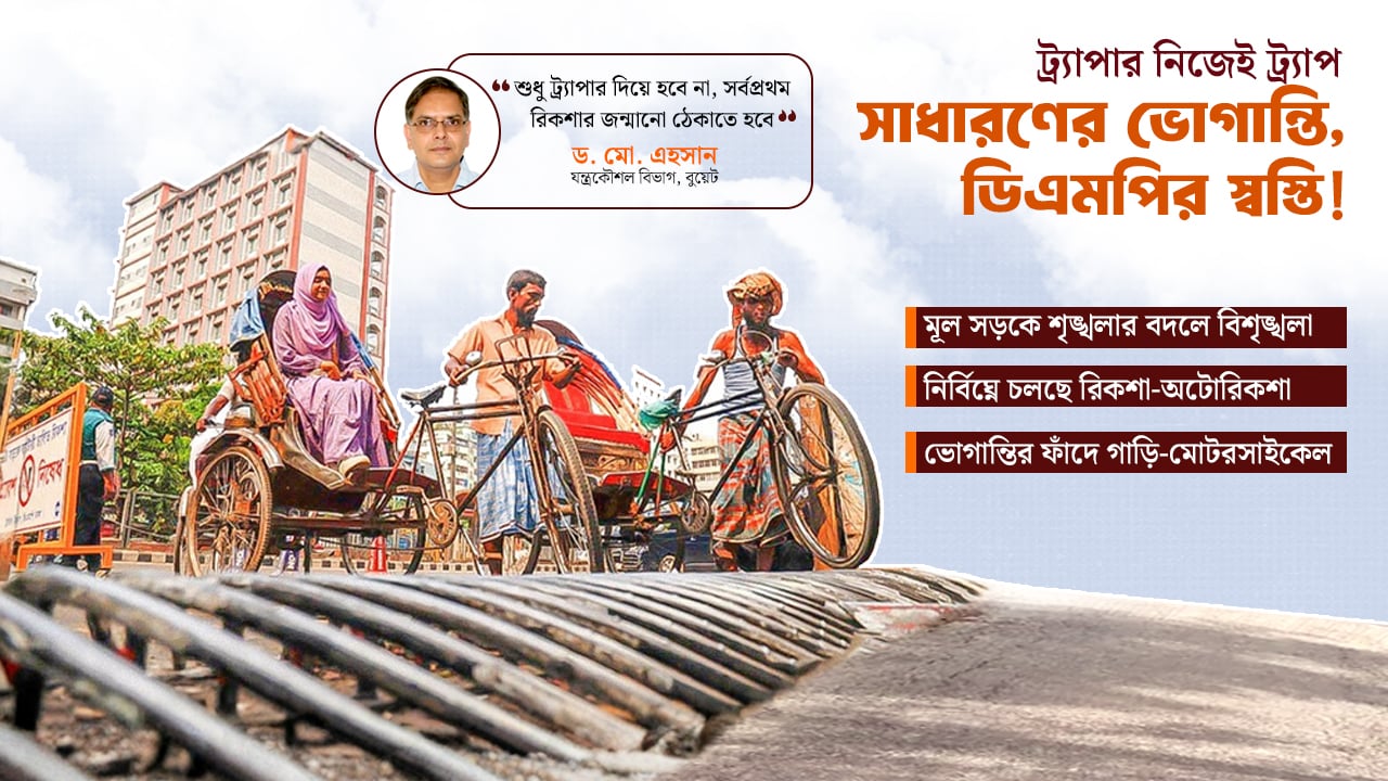 রাজধানীর সড়কে রিকশা নিয়ন্ত্রণে ব্যর্থ হয়ে ‘দেখনদারি’ পদক্ষেপ নিয়েছিল ঢাকা মহানগর পুলিশের (ডিএমপি) ট্রাফিক বিভাগ। পরীক্ষামূলকভাবে বসানো হয় ব্যয়বহুল ‘রিকশা ট্র্যাপার’। এটির মাধ্যমে রিকশাকে মূল সড়কে ওঠা থেকে আটকানোর কথা ছিল। কিন্তু বাস্তবতা পুরোপুরি উল্টো। রিকশা দিব্যি পার হয়ে যাচ্ছে, আর ভোগান্তির শিকার হচ্ছেন গাড়ি ও মোটরসাইকেল চালকরা।