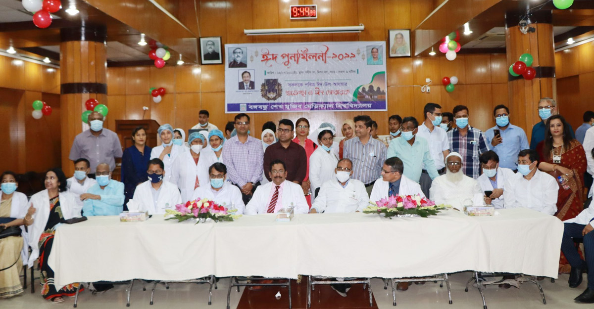 এর আগে সকাল সাড়ে ৯টা থেকে ১০টা পর্যন্ত সৌহার্দ্য, সম্প্রীতি ও শুভেচ্ছা বিনিময়ের মাধ্যমে বঙ্গবন্ধু শেখ মুজিব মেডিকেল বিশ্ববিদ্যালয়ে ঈদ পুনর্মিলনী-২০২২ অনুষ্ঠিত হয়। উপাচার্য অধ্যাপক ডা. মো. শারফুদ্দিন আহমেদ বিশ্ববিদ্যালয়ের শিক্ষক, শিক্ষার্থী, চিকিৎসক, কর্মকর্তা, নার্স, মেডিকেল টেকনোলজিস্ট ও কর্মচারীদের সঙ্গে শুভেচ্ছা বিনিময় করেন।
