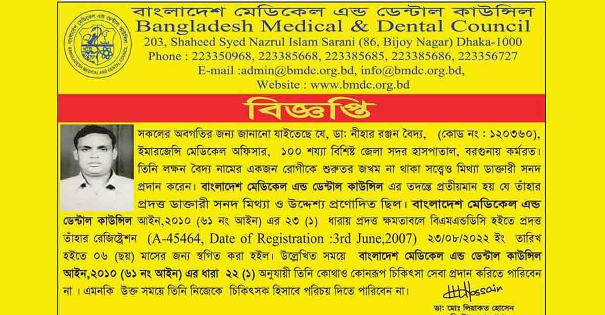 রোগীকে মিথ্যা চিকিৎসাসনদ দেওয়ার মাধ্যমে প্রতারণার অভিযোগ প্রমাণিত হওয়ায় ডা. নীহার রঞ্জন বৈদ্য নামে এক চিকিৎসককে শাস্তির আওতায় এনেছে বাংলাদেশ মেডিকেল অ্যান্ড ডেন্টাল কাউন্সিল (বিএমডিসি)। আগামী ৬ মাসের জন্য তার বিএমডিসি রেজিস্ট্রেশন স্থগিত করা হয়েছে।