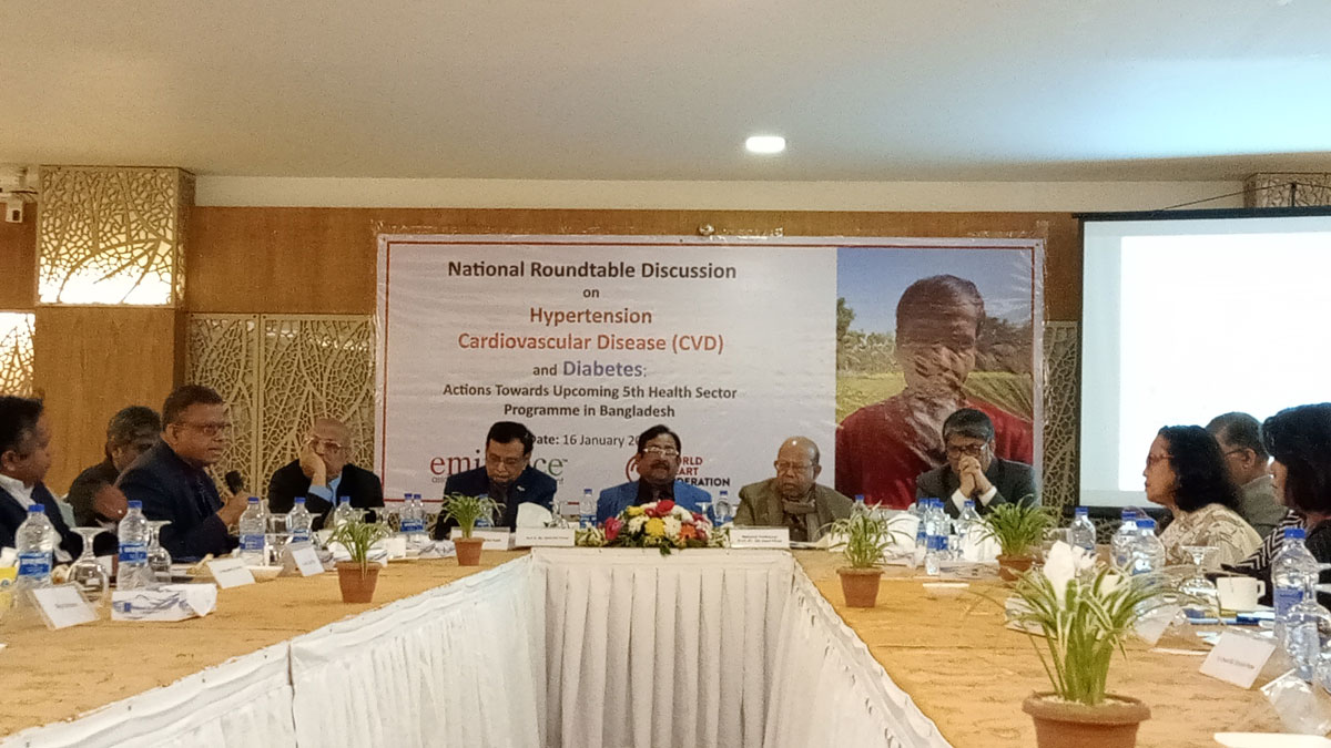 সোমবার (১৬ জানুয়ারি) দুপুরে এমিনেন্স অ্যাসোসিয়েটস ফর সোশ্যাল ডেভেলপমেন্ট এবং ওয়ার্ল্ড হার্ট ফেডারেশন আয়োজিত ‘উচ্চ রক্তচাপ, সিডিডি এবং ডায়াবেটিস: আসন্ন পঞ্চম স্বাস্থ্য খাতের কর্মসূচির দিকে পদক্ষেপ’ শীর্ষক জাতীয় গোলটেবিল আলোচনাসভায় বক্তারা এসব কথা বলেন।