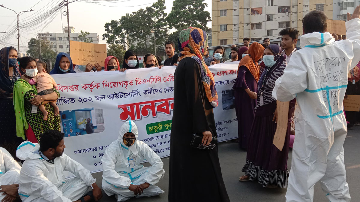 প্রায় এক বছর যাবৎ বেতন না পাওয়ার অভিযোগ ডিএনসিসি ডেডিকেটেড কোভিড-১৯ হাসপাতালে আউট সোর্সিং পদ্ধতিতে নিয়োগপ্রাপ্ত স্বাস্থ্যসেবা কর্মীদের। এরমধ্যেই আবার চাকরিচ্যুতির ঘোষণা দিয়েছে হাসপাতাল কর্তৃপক্ষ। এই অবস্থায় বেতনের দাবিতে সড়কে নেমে বিক্ষোভ করেছেন এ কর্মীরা।