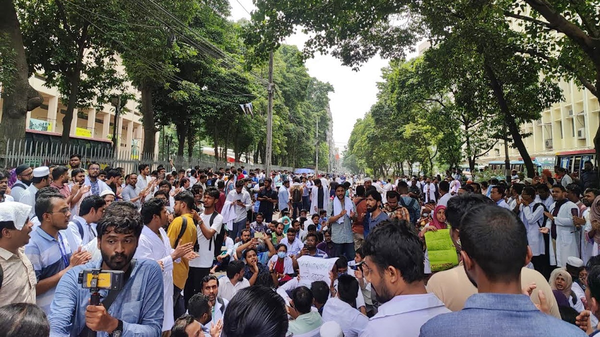 এর আগে দুপুর ১টার দিকে বঙ্গবন্ধু শেখ মুজিব মেডিকেল বিশ্ববিদ্যালয়ের (বিএসএমএমইউ) ভেতর থেকে শাহবাগ মোড়ে অবস্থান নিতে চাইলে পুলিশ ও চিকিৎসকদের মাঝে ধস্তাধস্তি হয়। এরপর একপর্যায়ে শাহবাগের সায়েন্স-ল্যাবের রাস্তা অবরোধ করে সেখানে অবস্থান নেন তারা।