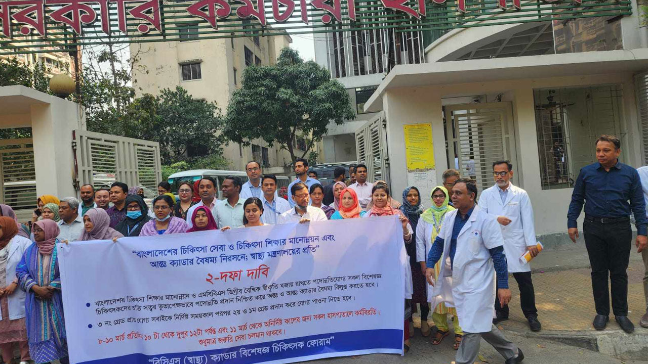 এর আগে শুক্রবার (৭ মার্চ) ফোরামের পক্ষে ডা. মোহাম্মদ আল আমিন স্বাক্ষরিত এক প্রেস বিজ্ঞপ্তিতে দুই দফা দাবিতে শনিবার থেকে কর্মবিরতি শুরুর কথা জানানো হয়। প্রেস বিজ্ঞপ্তিতে বলা হয়, বাংলাদেশের সরকারি হাসপাতালে কর্মরত বিশেষজ্ঞ চিকিৎসকরা ন্যায্য পদোন্নতি ও সব প্রকার বৈষম্য নিরসনের দাবিতে কর্মসূচি ঘোষণা করেছেন। বিসিএস (স্বাস্থ্য) বিশেষজ্ঞ ফোরামের উদ্যোগে ও সব চিকিৎসা সোসাইটির সমর্থনে ৮, ৯ ও ১০ মার্চ প্রতিদিন সকাল ১০টা থেকে ১২টা পর্যন্ত কর্মবিরতি পালিত হবে।