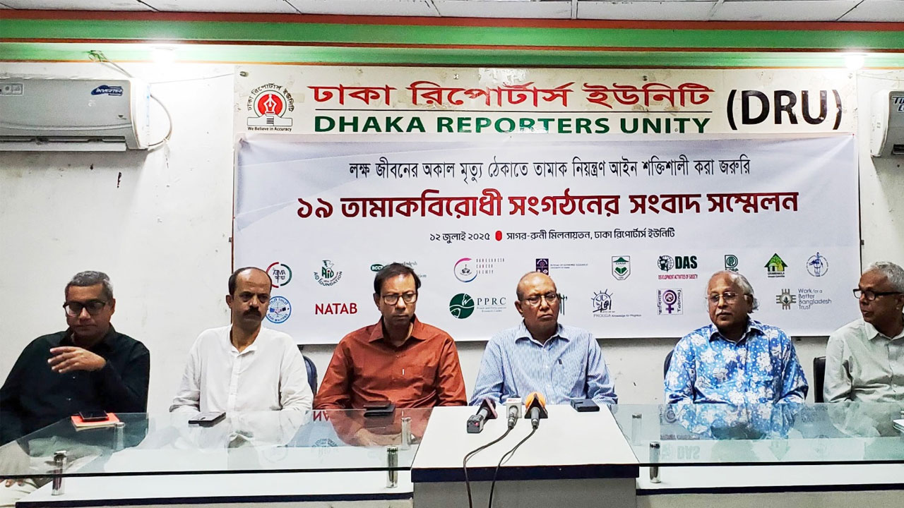 আজ (শনিবার) দুপুরে ঢাকা রিপোর্টার্স ইউনিটির সাগর-রুনি মিলনায়তনে আয়োজিত এক যৌথ সংবাদ সম্মেলনে বক্তারা এ দাবি জানান। সংবাদ সম্মেলনটি যৌথভাবে আয়োজন করে অ্যান্টি টোব্যাকো মিডিয়া এলায়েন্স (আত্মা), এইড ফাউন্ডেশন, বাংলাদেশ ক্যানসার সোসাইটি, বিসিসিপি, বিইআর, ঢাকা আহছানিয়া মিশন, ডাস, ডর্প, গ্রাম বাংলা উন্নয়ন কমিটি, মানস, নারী মৈত্রী, নাটাব, ন্যাশনাল হার্ট ফাউন্ডেশন, পিপিআরসি, প্রত্যাশা, তাবিনাজ, টিসিআরসি, ডব্লিউবিবি ট্রাস্ট এবং প্রজ্ঞা।