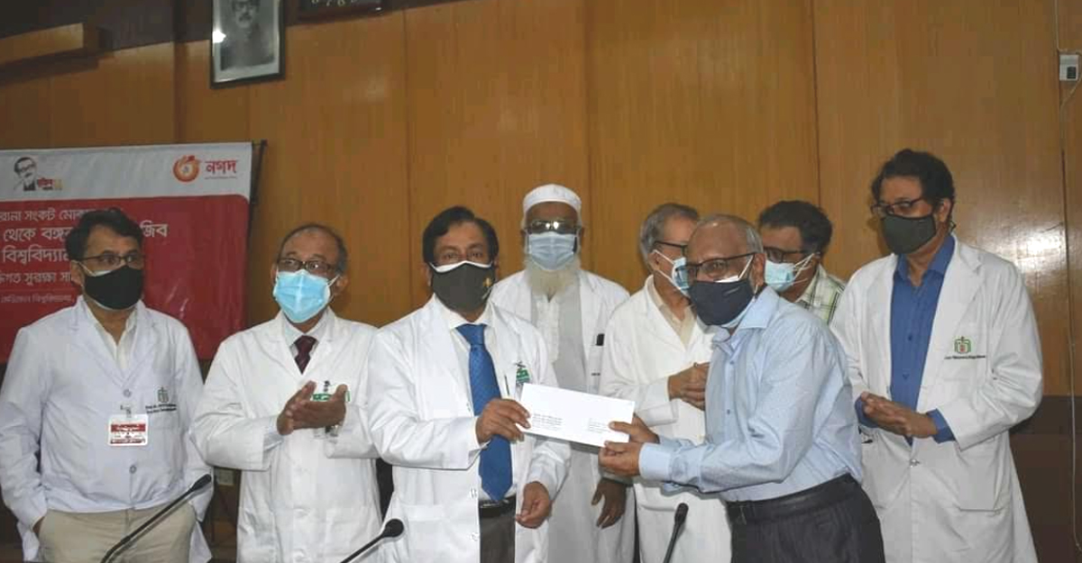 বঙ্গবন্ধু শেখ মুজিব মেডিকেল বিশ্ববিদ্যালয়ের চিকিৎসক, নার্স, স্বাস্থ্যকর্মীদের জন্য ডাক বিভাগের ডিজিটাল লেনদেন ‘নগদ’ এর পক্ষ থেকে স্বাস্থ্য সুরক্ষা সামগ্রী পিপিই, মাস্ক, হ্যান্ড স্যানিটাইজার ইত্যাদি দেওয়া হয়েছে।