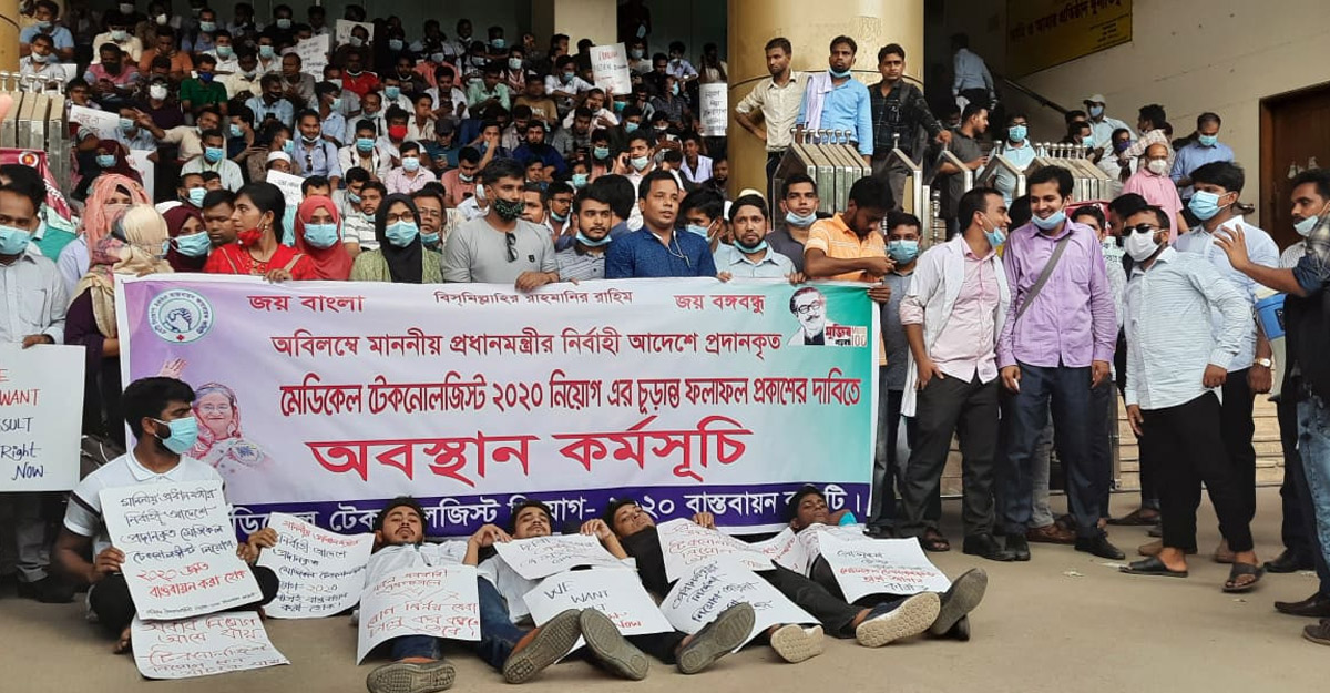 তিনি আরও বলেন, আমরা দীর্ঘদিন ধরে আমাদের বিভিন্ন দাবি কর্তৃপক্ষের কাছে জানিয়ে আসছি। কিন্তু তাদের নির্লিপ্ততার জন্য আমরা স্তম্ভিত। জরুরি ভিত্তিতে ১২০০টি মেডিকেল টেকনোলজিস্ট পদে নিয়োগ প্রক্রিয়ার লিখিত পরীক্ষায় উত্তীর্ণ এবং মৌখিক পরীক্ষায় অংশগ্রহণ করে দীর্ঘ সাত মাসের বেশি সময় ধরে অপেক্ষা করছি। কিন্তু ফল প্রকাশ করা হয়নি।