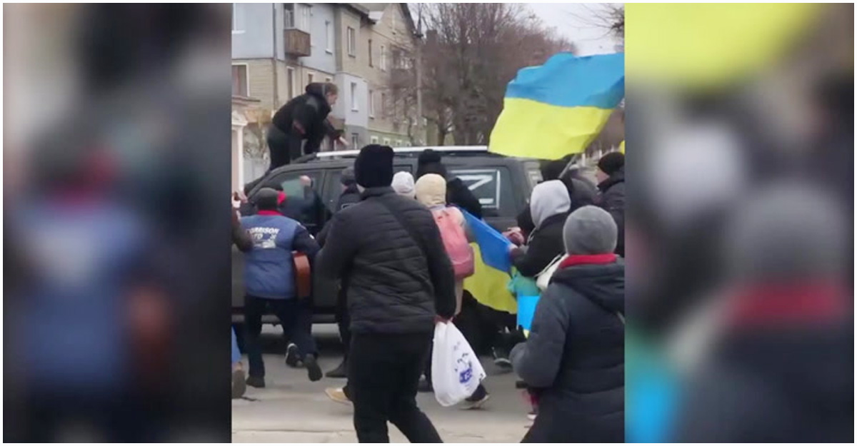 এর একটি ভিডিওতে দেখা যায়, রাশিয়ার সামরিক বাহিনীর একটি ৪এক্স৪ গাড়ি আসছে। সেই গাড়ি লক্ষ্য করে ছুটে যাচ্ছেন কয়েক ডজন ইউক্রেনীয়। একেবারে শূন্য হাতে তারা চারদিক থেকে গাড়িটি ঘিরে ধরে প্রতিবাদ করছেন। এ সময় এক ব্যক্তি গাড়ির সামনের দিকে ওপরে উঠে লাথি মারতে থাকেন।