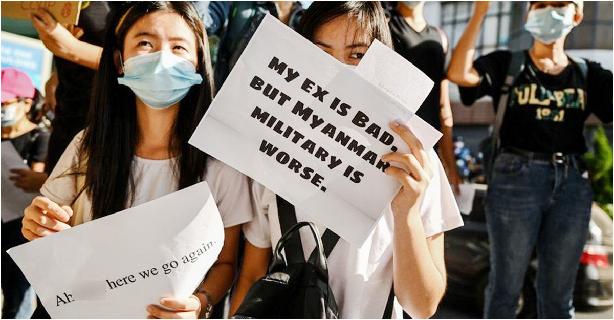 হাজার হাজার মানুষের ভিড়ে এরকম একটি প্ল্যাকার্ড হাতে একজনকে বিক্ষোভ করতে দেখা যায়। যেখানে লেখা রয়েছে, ‘আমার সাবেক প্রেমিকের চেয়েও মিয়ানমার সেনাবাহিনী খারাপ।’