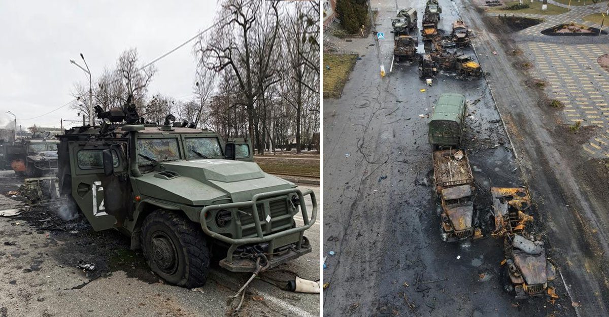 ইউক্রেনের খারকিভ ও বরোদিয়াঙ্কা শহরের রাস্তায় ধ্বংসপ্রাপ্ত রুশ সামরিক যানের বহর