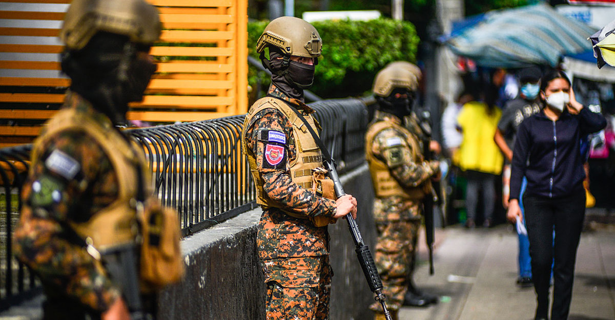 রাস্তার দোকান, শপিং প্লাজা ও গণপরিবহনে গ্যাং সদস্যদের তল্লাশি অভিযানের আগে পাহারা দিচ্ছেন এল সালভেদরের সেনা সদস্যরা। ২০২১ সালের ২০ জুলাইয়ের ছবি