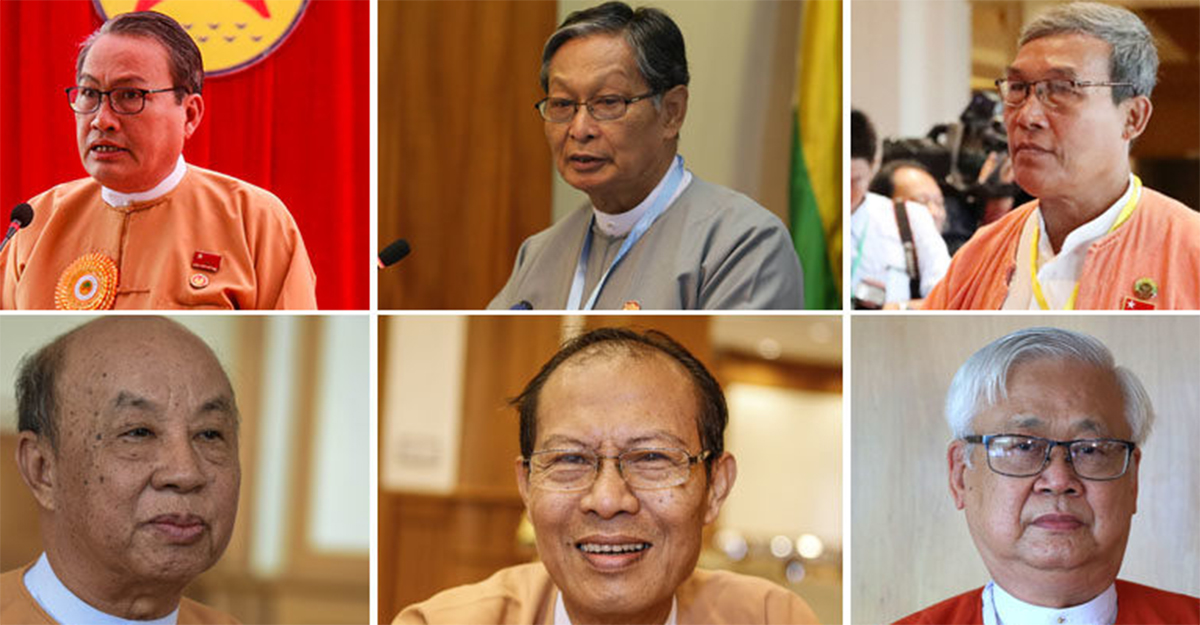 এনএলডির গ্রেপ্তারকৃত ছয় শীর্ষ নেতা; (উপরসারির বাম থেকে) ডা. আয়ে জান, উ কাউ টিন্ত সোয়ে, উ নি পু, উ হুতুন হুতুন হেইন, ডা. মিয়ো অং এবং এনএলডি’র আইনি পরামর্শক উ কাও হো। ছবি-ইরাবতী