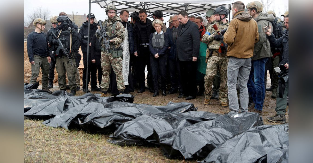 ইউক্রেনের বুচা শহর পরিদর্শনের সময় একটি গণকবরের পাশে ইউরোপীয় কমিশনের প্রেসিডেন্ট উরসুলা ভন ডার লেইন, স্লোভাকিয়ার প্রধানমন্ত্রী এডুয়ার্ড হেগার এবং ইউক্রেনের প্রধানমন্ত্রী ডেনিস শ্যামিহাল। গত ৮ এপ্রিলের ছবি
