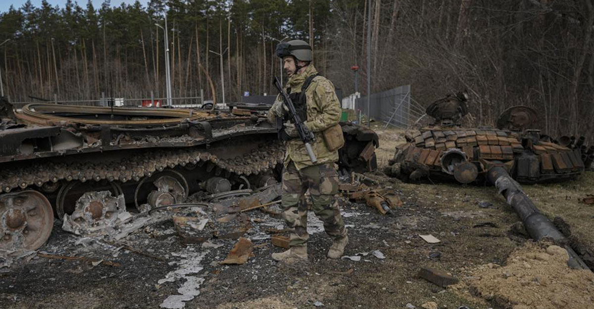 ইউক্রেনের স্টোয়াঙ্কায় রাশিয়ার সামরিক বাহিনীর ট্যাংকের ধ্বংসাবশেষের পাশে হাঁটছেন এক ইউক্রেনীয় সেনা। গত ২৭ মার্চের ছবি