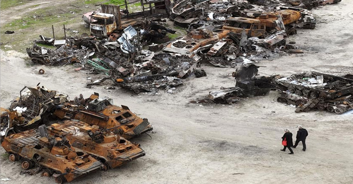 ইউক্রেনের রাজধানী কিয়েভের উপকণ্ঠে বুচায় সামরিক যানের ধ্বংসাবশেষের পাশ দিয়ে হেঁটে যাচ্ছে মানুষ। শনিবারের ছবি