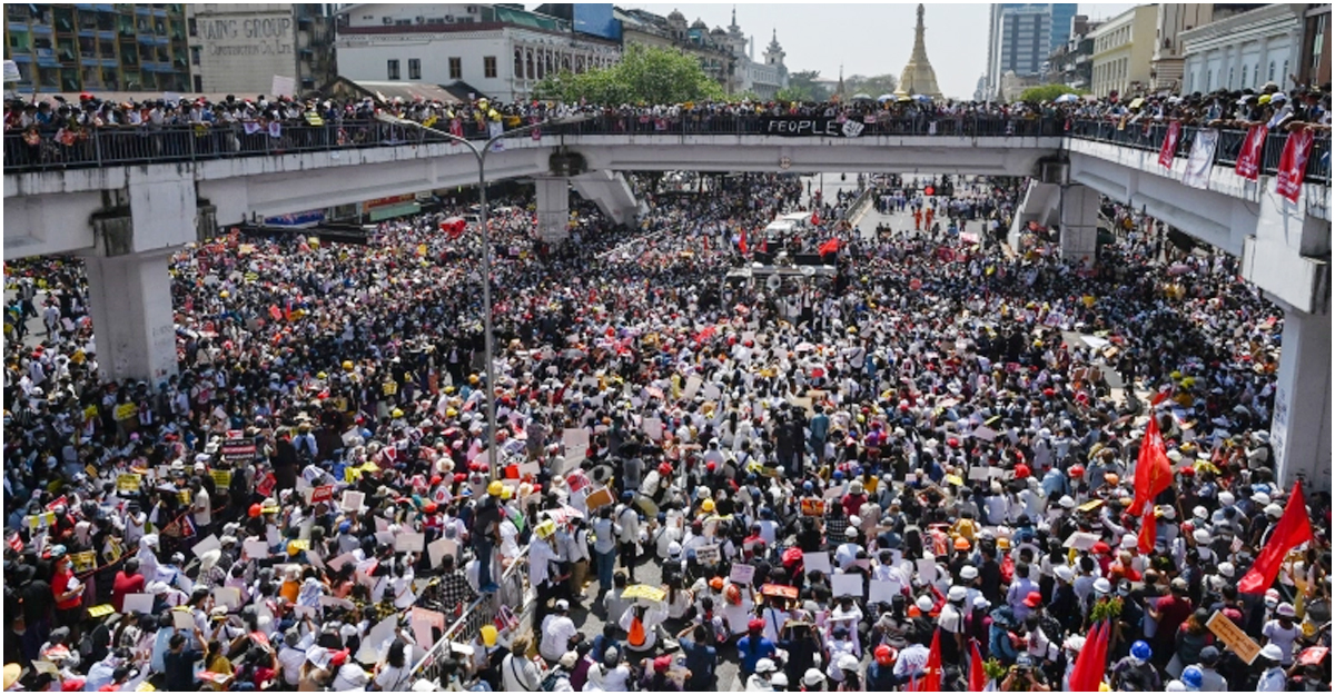 সহিংসতার তীব্র আশঙ্কার মাঝে মিয়ানমারে সামরিক অভ্যুত্থানের বিরোধিতায় হাজার হাজার মানুষ ইয়াঙ্গুনে জড়ো হয়ে সবচেয়ে যে বড় বিক্ষোভ শুরু করেছেন; তাতে অচল হয়ে পড়ছে দেশটির বৃহত্তম এই শহর। সেনাবাহিনীর বিরুদ্ধে ক্ষোভের প্রকাশ ঘটাতে বুধবার ইয়াঙ্গুনে এই বিক্ষোভে অংশ নিয়েছেন হাজারও মানুষ।