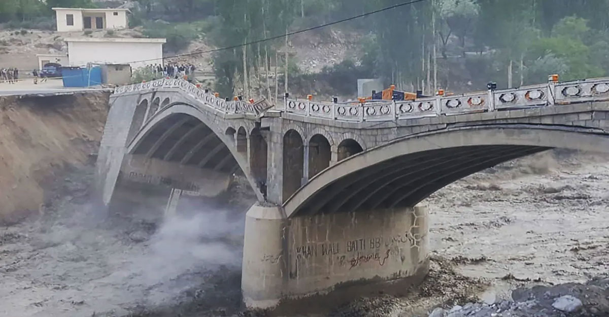 আকস্মিক বন্যায় পাকিস্তানের উত্তরাঞ্চলীয় হুনজা জেলায় ক্ষতিগ্রস্ত একটি সেতু