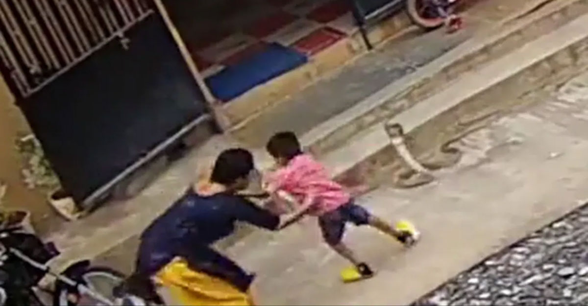 ঘর আর রাস্তা একইসঙ্গে। আর সেই ঘর থেকেই মা আর ছেলে একসাথে বাইরে বের হচ্ছিলেন। সেই সময়ই বাঁধে বিপত্তি। ঘর থেকে এক পা ফেলে বাইরে বের হতেই সাপের কবলে পড়ে ছেলে শিশুটি। সঙ্গে সঙ্গে চরম সাহসিকতায় সন্তানকে সরিয়ে নেন তার মা।