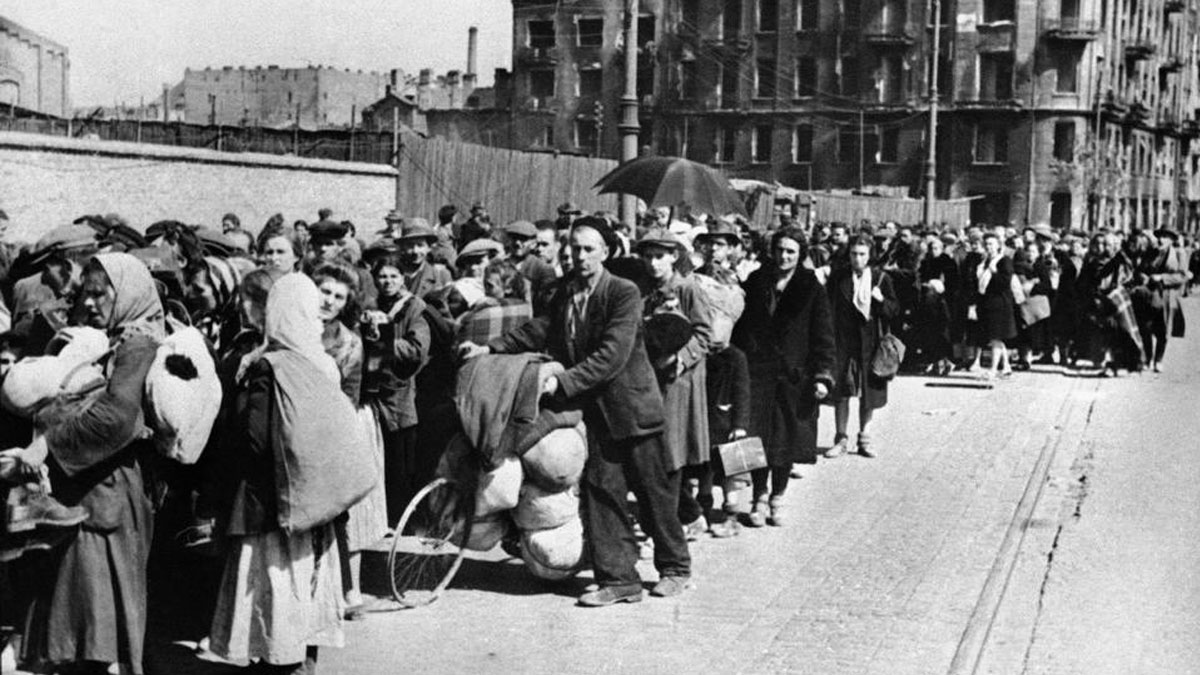 ওয়ারশের রাস্তায় পোলিশ পুরুষ ও নারীদের দীর্ঘ লাইন। যুদ্ধের জেরে আশ্রয়ের জন্য তারা কম ধ্বংসপ্রাপ্ত জেলার দিকে যাচ্ছেন। ১৯৪৪ সালের ছবি