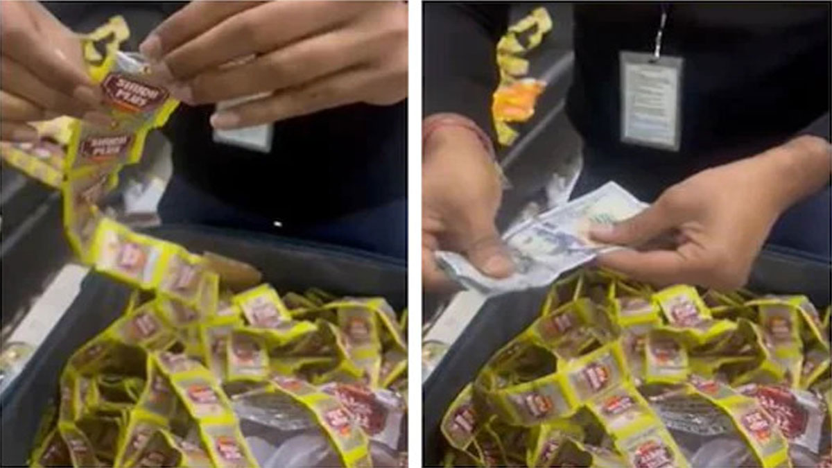 শুল্ক দপ্তরের তল্লাশির একটি ভিডিও প্রকাশ্যে এসেছে। সেখানে দেখা যাচ্ছে, প্রতিটি পান মশলার প্যাকেটের মধ্যে পরিপাটি করে ভাঁজ করে দুটি করে দশ ডলারের নোট রাখা রয়েছে। এভাবেই শয়ে শয়ে পান মশলার প্যাকেটে ডলার লুকিয়ে পাচারের চেষ্টা চলছে। ওই ব্যক্তিকে জেরা করে এর নেপথ্যে বড় কোনো চক্র আছে কি না, তা খতিয়ে দেখছেন শুল্ক দপ্তরের কর্মকর্তারা।