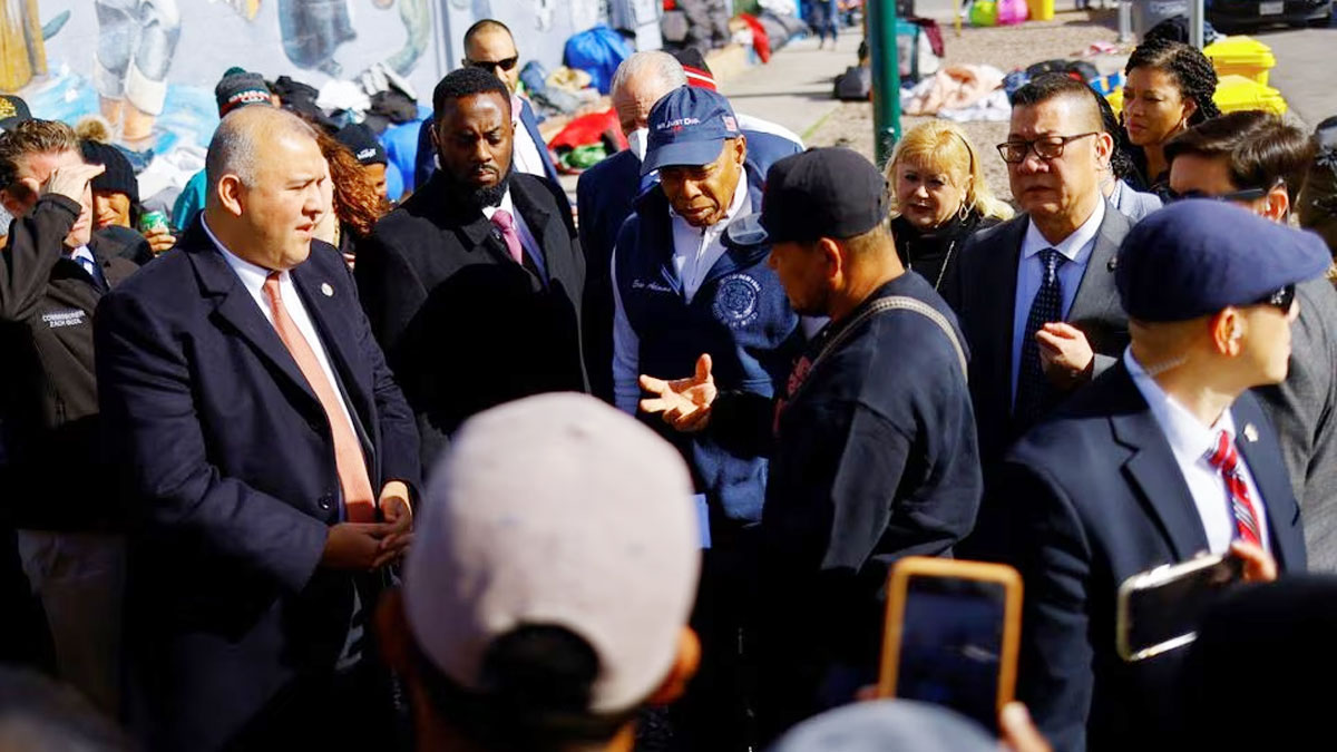 টেক্সাসের এল পাসোতে স্থানীয় কর্তৃপক্ষের সাথে অভিবাসন নিয়ে আলোচনার জন্য একটি আশ্রয় কেন্দ্রের বাইরে দাঁড়িয়ে আছেন নিউইয়র্ক সিটির মেয়র এরিক অ্যাডামস। রোববারের ছবি