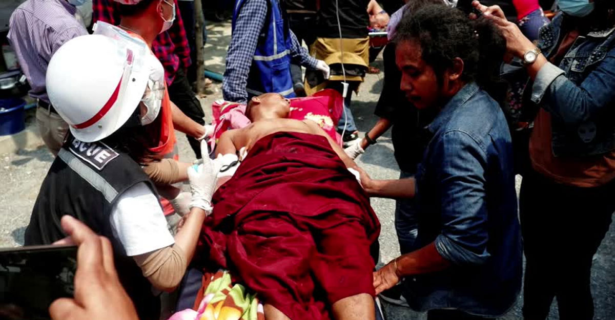 সি থু তুন নামের একজন বিক্ষোভকারী দুজনকে গুলিবিদ্ধ অবস্থায় দেখেছেন। যাদের মধ্যে একজন বৌদ্ধ ভিক্ষু। তিনি বলেন, একজনের উরুতে গুলি লেগেছে। অপরজন গুলিতে মারা গেছেন।