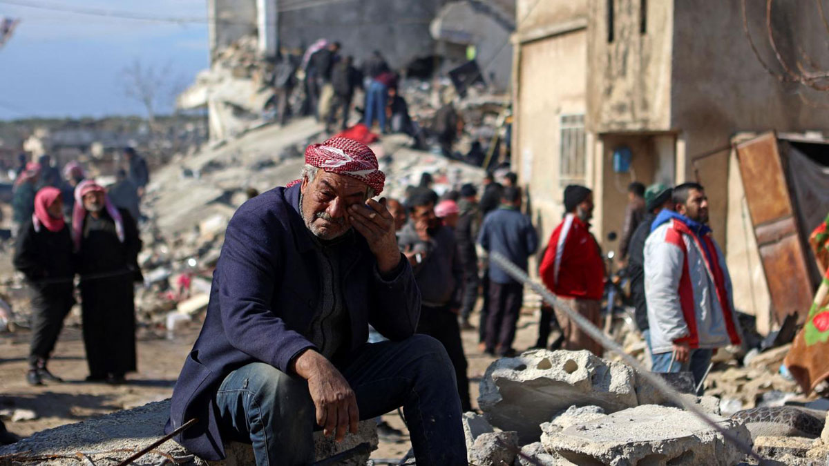 সিরিয়ার জিন্দারিস শহরে ভূমিকম্পের আঘাতে ধসে পড়া ভবনের সামনে বসে কাঁদছেন এক বৃদ্ধ -এএফপি