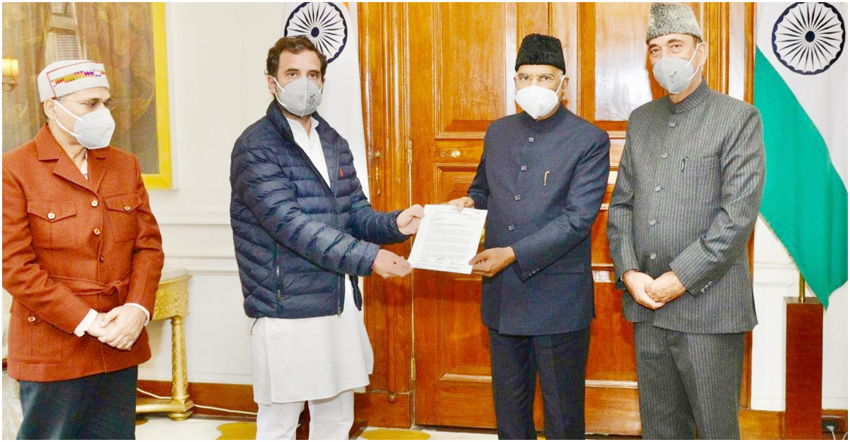 বৃহস্পতিবার স্থানীয় সময় বেলা পৌনে ১১টার দিকে লোকসভায় কংগ্রেসের একাধিক এমপি এবং দলের কয়েকজন জ্যেষ্ঠ নেতাসহ দিল্লির বিজয় চক থেকে রাষ্ট্রপতি ভবনের উদ্দেশ্যে রওয়ানা হন রাহুল গান্ধী। দুপুর ১২টার দিকে রাষ্ট্রপতি রামনাথ কোবিন্দের সঙ্গে সাক্ষাৎ করে স্মারক ও স্বাক্ষর হস্তান্তর করেন তিনি। এ সময় তার সঙ্গে ছিলেন কংগ্রেস নেতা গোলাম নবী আজাদ এবং অধীর রঞ্জন চৌধুরী।