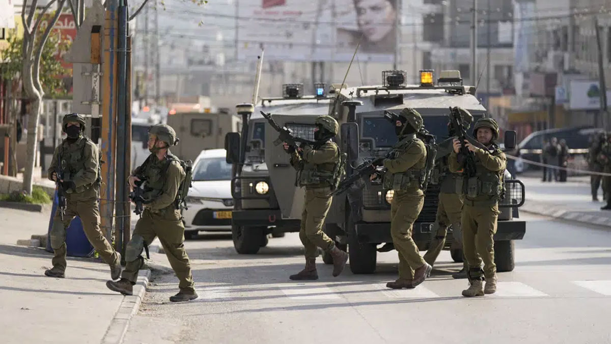 পশ্চিম তীরের শহর নাবলুসের কাছে হাওয়ারা চেকপয়েন্টে ফিলিস্তিনির হামলায় দুই বসতি স্থাপনকারী নিহতের পর ঘটনাস্থলে ইসরায়েলি সৈন্যদের অবস্থান। রোববারের ছবি