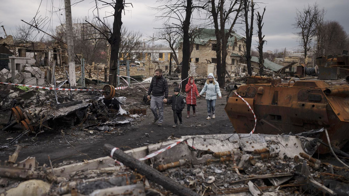 ইউক্রেনের বুচায় ধ্বংস হওয়া রাশিয়ান ট্যাংকের পাশ দিয়ে হাঁটছে একটি পরিবার। ছবিটি ২০২২ সালের এপ্রিল মাসে তোলা