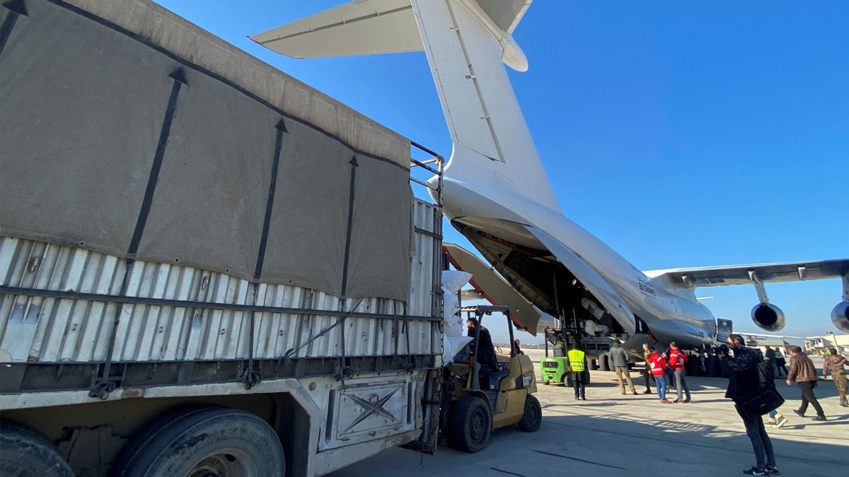 আলেপ্পো আন্তর্জাতিক বিমানবন্দরে সৌদি আরবের একটি সহায়তা বিমান। ছবিটি গত ১৪ ফেব্রুয়ারি তোলা